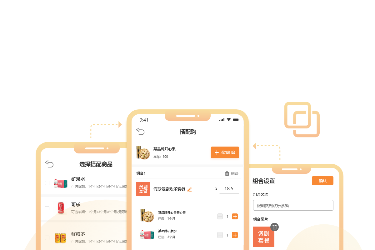 组合购:自由组合您的商品 您可以任意组合多个店铺商品,制作商品套餐(支持单独设定套餐价格),无需多次上传商品,省时又高效